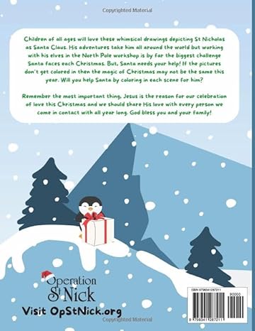 Children of all ages will love these whimsical drawings depicting St Nicholas as Santa Claus. His adventures take him all around the world but working with his elves in the North Pole workshop is by far the biggest challenge Santa faces each Christmas. But, Santa needs your help! If the pictures don’t get colored in then the magic of Christmas may be lost. Will you help Santa by coloring in each scene for him?