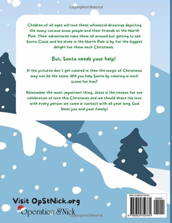Children of all ages will love these whimsical drawings depicting the many curious snow people and their friends at the North Pole. Their adventures take them all around but getting to see Santa Claus and his elves in the North Pole is by far the biggest delight for them each Christmas.